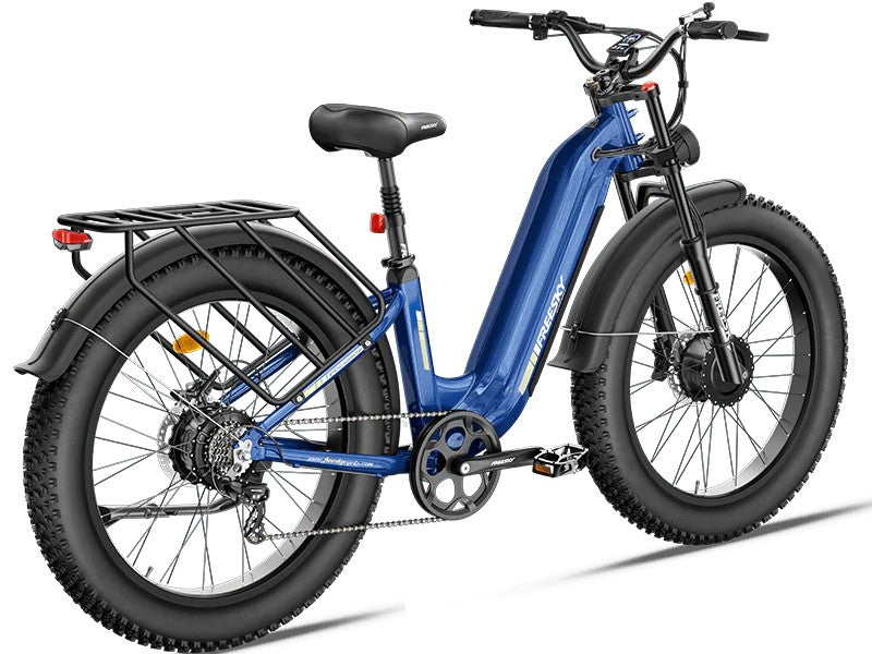 The Freesky Ranger M‑540 is a powerhouse electric bike tailored for riding versatility and ease. Its dual 1000 W hub motors provide smooth, balanced power, while the step‑through frame ensures easy mounting regardless of attire. With fat 26" x 4" tyres and downhill‑style full suspension, this e‑bike conquers rough terrain while remaining commuter‑friendly. Ideal for riders seeking adventure without sacrificing everyday comfort.