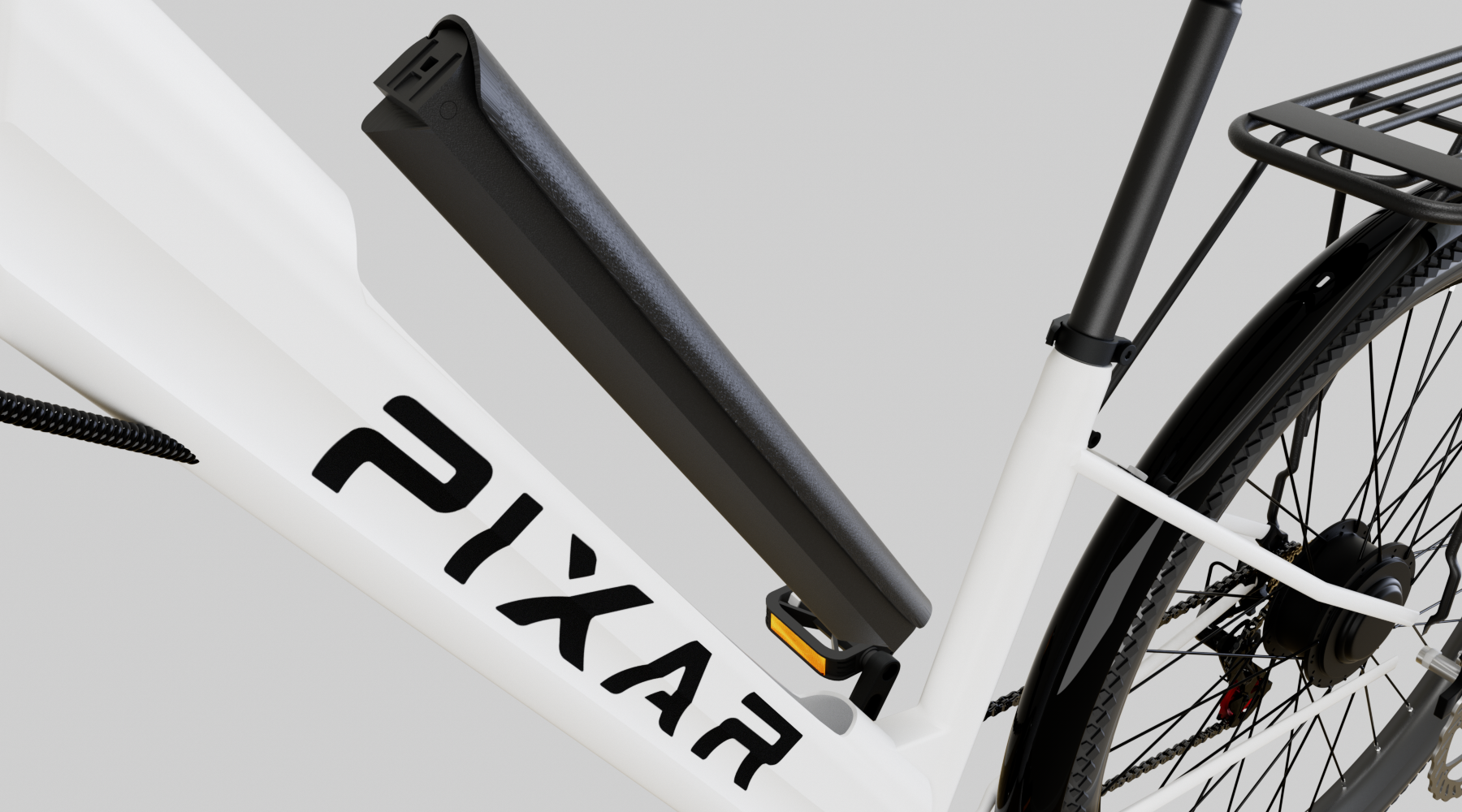 PIXAR E-Bike - Samsung 36 V 12.8 Ah battery (≈460 Wh) offering long range and quick-release convenience.